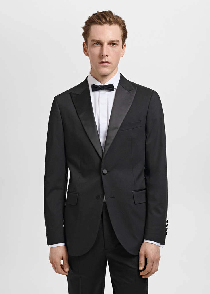 Tailoring collection. Slim fit. Contrasting satin peak lapels. Front closure with buttons. Chest welt pocket. Two welt and flap pockets on the front. Buttoned strap cuffs. Two openings at the back of the hem