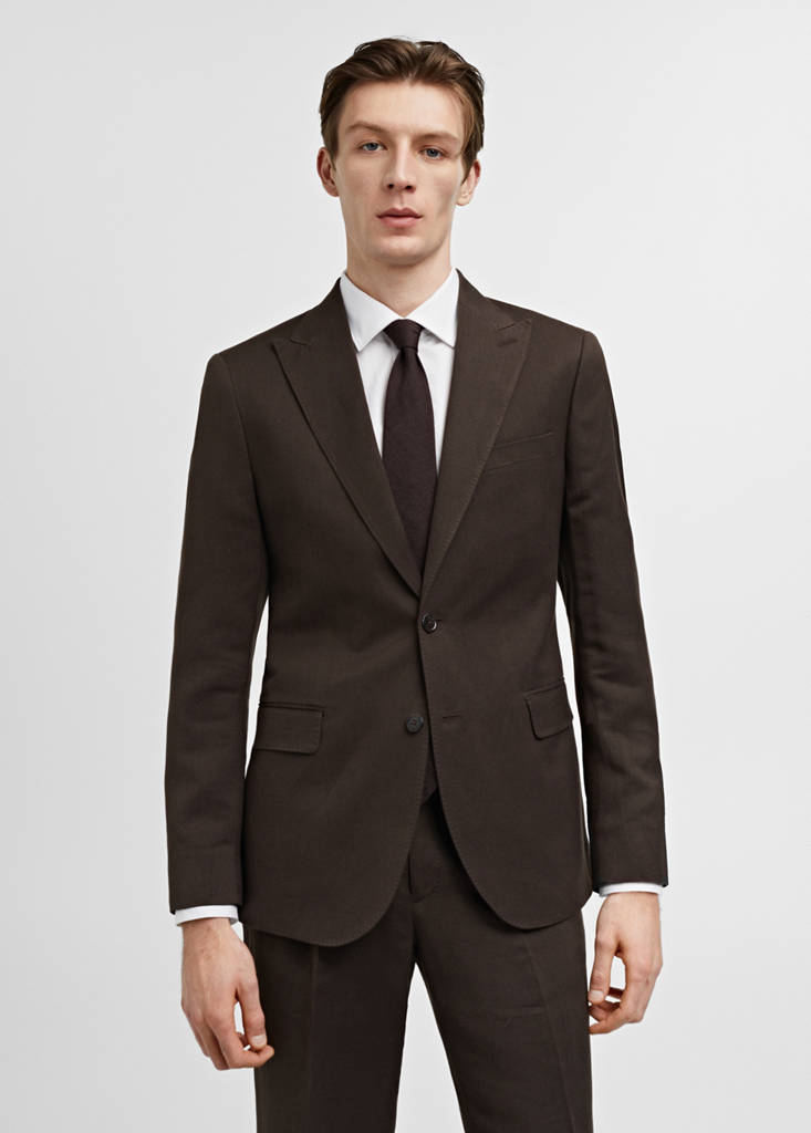 Slim fit. Cotton and linen blend fabric. Notch lapels and buttonhole. Chest welt pocket. Two front flap pockets. Long sleeves with buttoned strip cuffs. Inner lining. Two welt pockets inside. Tailoring collection. Front closure with buttons