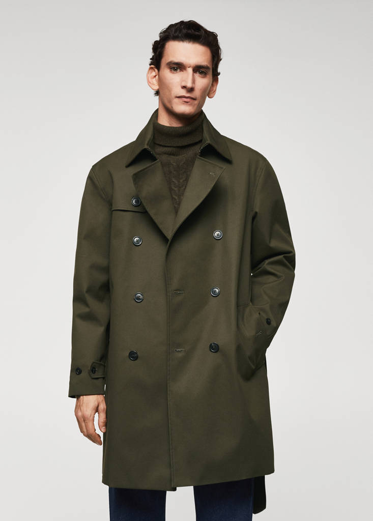 Basics Collection. Cotton-blend fabric. Water-repellent: The durable finish of this garment protects against light rain, repelling contact with water and raindrops. Medium design. Loops on the shoulders. Lapel with notch. Long sleeve. Loops on the cuffs. Two side pockets. Loops on the waist. Removable belt at the waist. Double button fastening. Inner lining. Inner pocket. The model is 185 cm tall and is wearing a size M