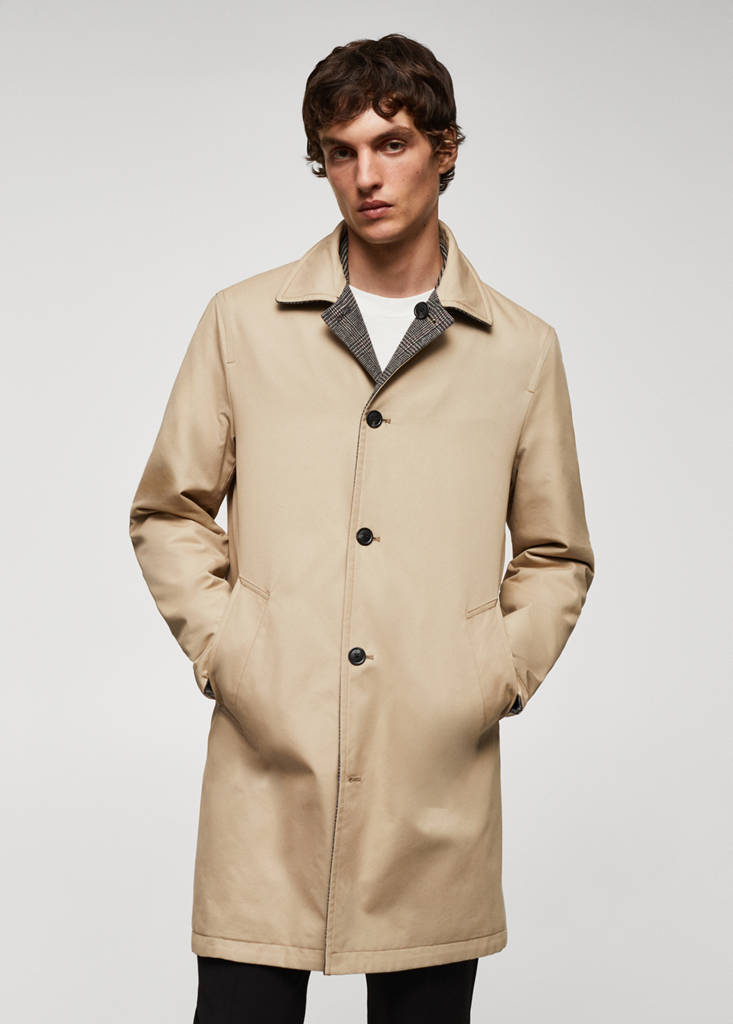 Regular fit. Reversible design. Raincoat. Recycled wool and recycled polyester-blend fabric. Tartan print. Long sleeves. Back vent at the hem. Water-repellent: The durable finish of this garment protects against light rain, repelling contact with water and raindrops. Front closure with buttons. Classic collar