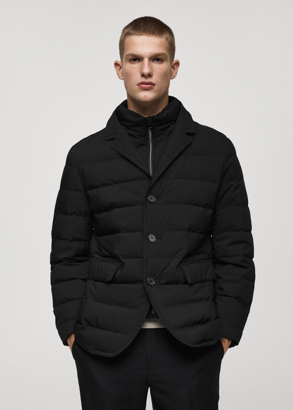 Quilted design. Notched lapel collar. Long sleeves. Perkins collar with detachable zip-closure option. Foldable and concealable hood. Two front flap pockets. Straight hem. Inner zipped pocket. The model is 190 cm tall and wears a size M. 70/30 down and feather filling. Water-repellent: The durable finish of this garment protects against light rain, repelling contact with water and raindrops. Windproof: This durable material offers protection against the wind for greater comfort in outdoor lifestyle. Front closure with buttons.