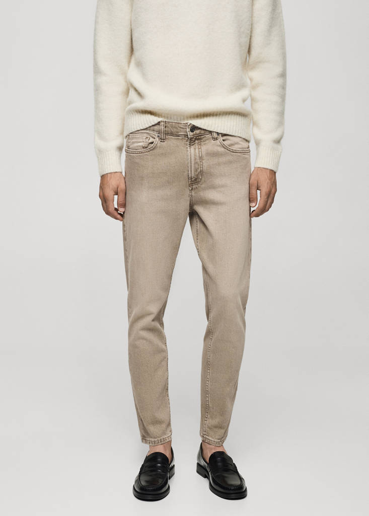 Tapered fit: wide cut at the top that narrows from the knee to the ankle. Cotton fabric. Crop design. Mid-rise. Coin pocket. Belt loops. Two patch pockets at the back. Zip and button fastening. Two front pockets