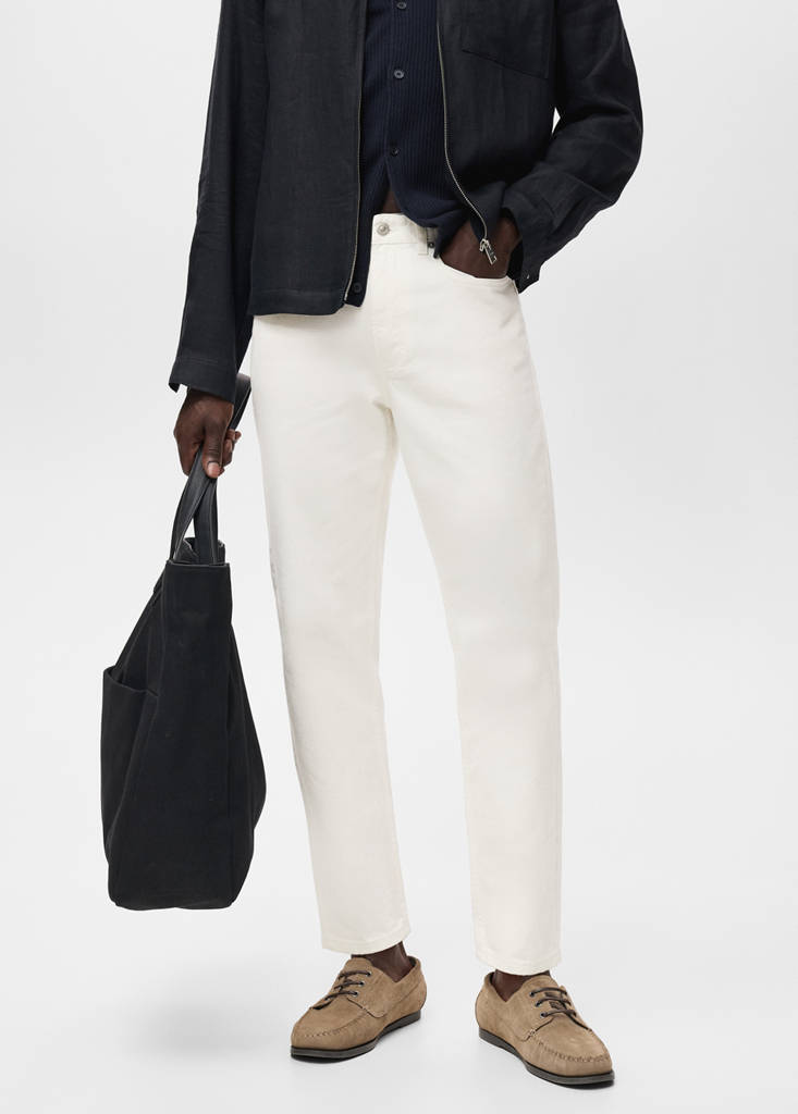 Tapered fit. 100% cotton fabric. Two front patch pockets. Coin pocket. Two patch pockets at the back. Zip and button fastening. Belt loops