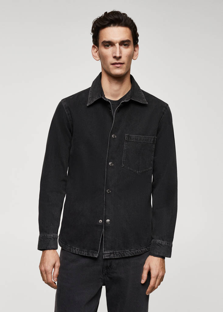 Slim fit. 100% Cotton. Denim-style cotton fabric. Dark grey wash. Press stud fastening on the front. Patch pocket on the chest. Regular fit. Classic collar. Long buttoned sleeves. Rounded base