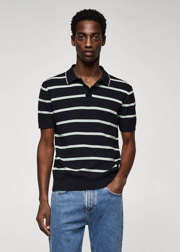 Striped design. Cotton-blend fabric. Structured fabric. Fine knit fabric. Polo neck. Button up. Short sleeve. The model is 187 cm tall and is wearing a size M