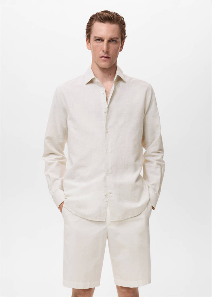 Regular Silhouette. Cotton and linen fabric. Shirt collar. Front closure with buttons. Long sleeves with buttoned cuffs. Detail of rear calipers. Rounded base