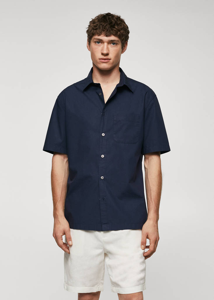 Regular fit. Cotton and lyocell blend fabric. Light fabric. Shirt-style collar. Short sleeve. Front button closure. Straight hem. Side slits. The model is 190 cm tall and is wearing a size M