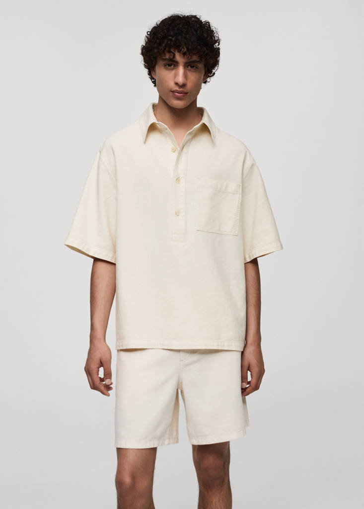 Set available as total look. Relaxed fit. Cotton fabric. Shirt collar. Short sleeves. Button fastening at the front. Patch pocket on the chest. Straight hem