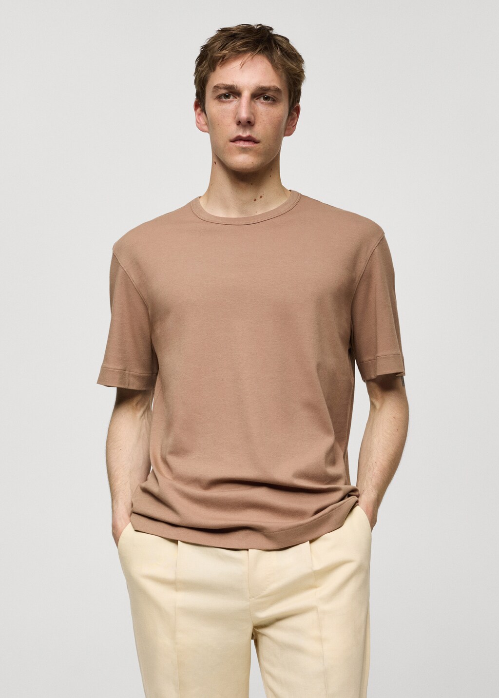Designed in Italy. Made in Portugal. Plain fabric. Round neck with ribbed finish. Short sleeves with stitched details. Straight hem with side slits. 100% cotton fabric.