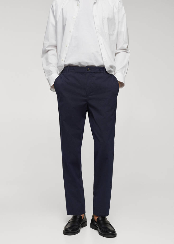 Seersucker fabric. Cotton fabric. Slim fit. Belt loops. Elastic waist with adjustable drawstring. Double button and zip closure. Two side pockets. Welt pocket with button on the back. Straight hem