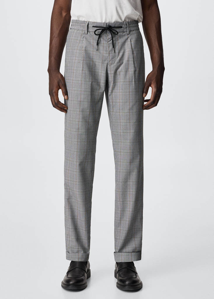 Jogger design. Check-pattern. Cotton-blend fabric. Elastic waist with adjustable drawstring. Zip and one button fastening. Two side pockets. Two welt pockets on the back. The model is 187 cm tall and is wearing a size 42