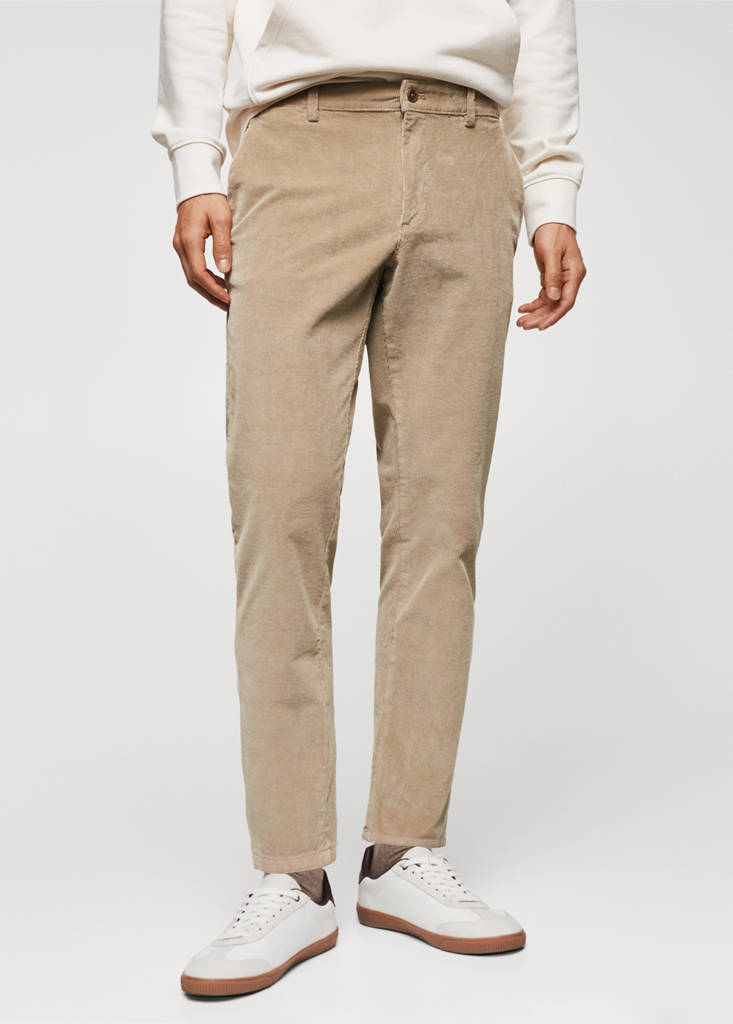 Tapered fit: wide cut at the top that narrows from the knee to the ankle. Cropped design. Cotton-blend fabric. Corduroy fabric. Loops. Zip and one button fastening. Two side pockets. Two patch pockets on the back. The model is 185 cm tall and is wearing a size 40