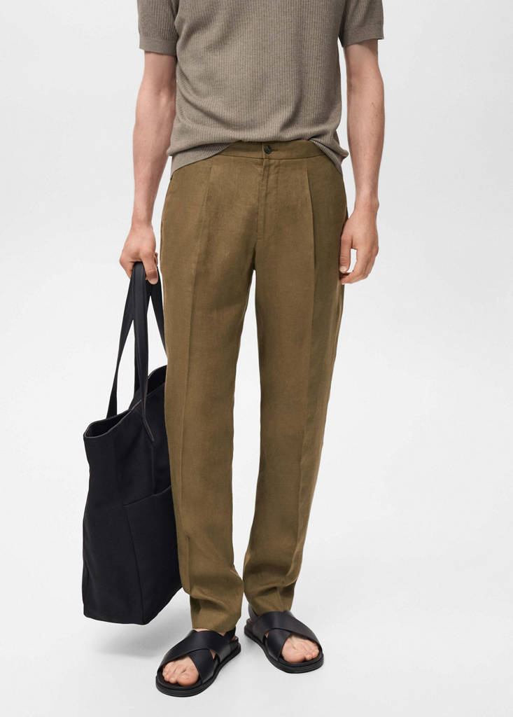 Slim fit. 100% linen fabric. Tailoring collection. Elastic waist at the back. Button and zip fastening. Two side pockets. Front pleat detail. Two welt pockets with button at the back