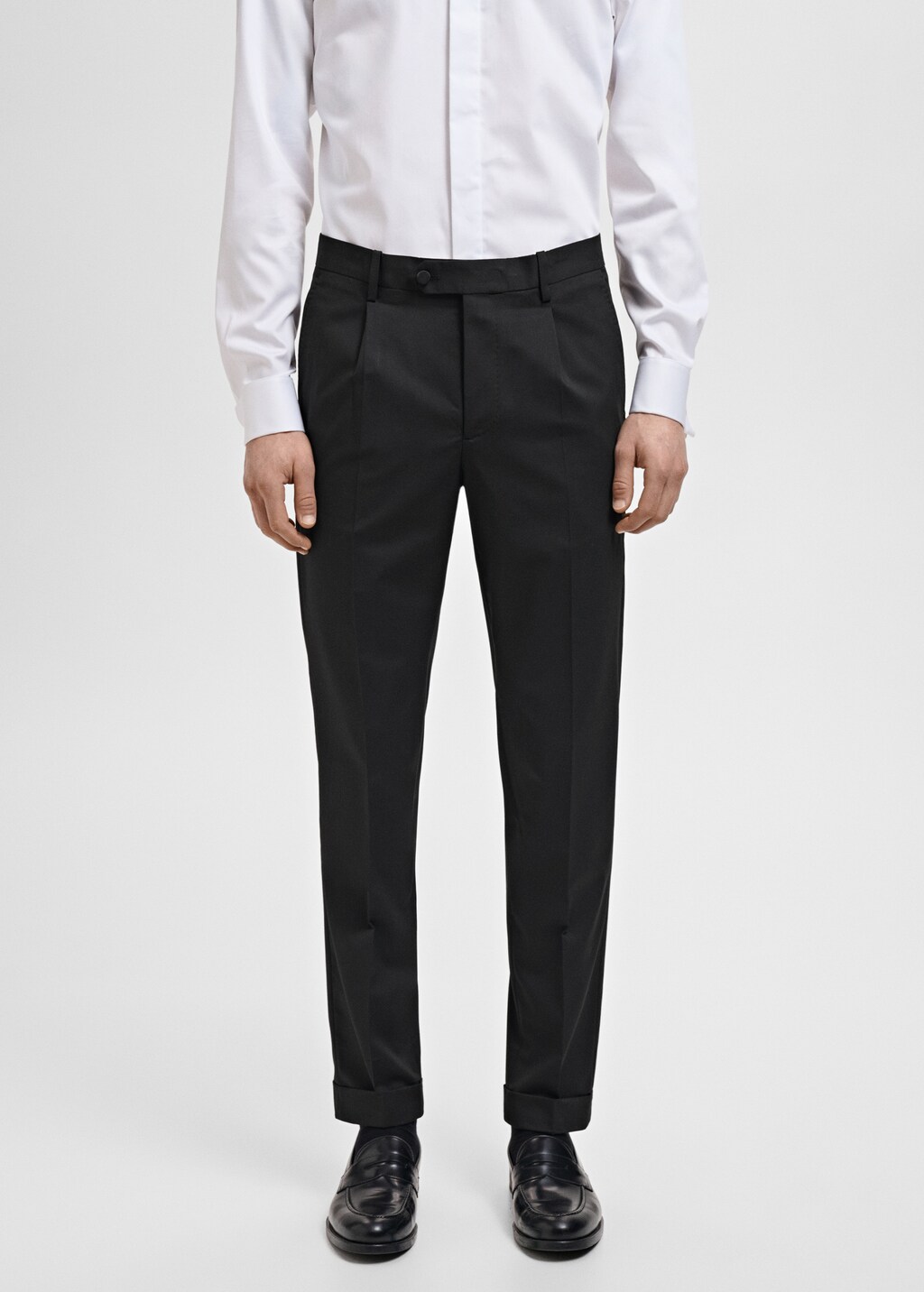 Tailoring collection. Straight design. Belt loops. Front fastening with double-breasted buttons and zip. Front pleat detail. Two side pockets. Two welt pockets with button at the back. Pressed crease detail at the front and back.