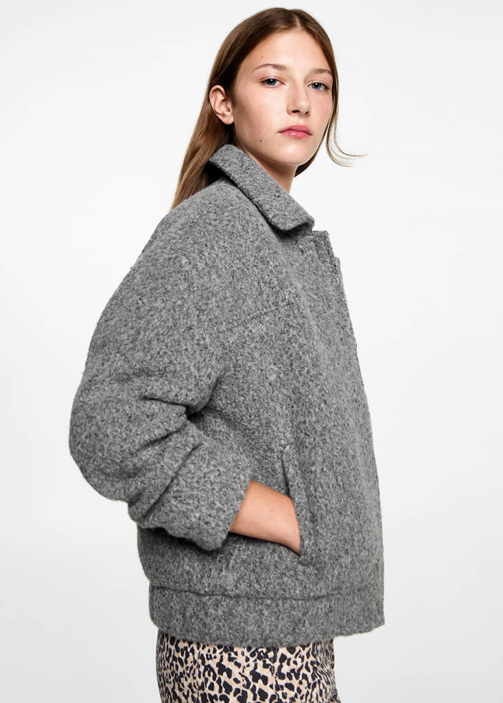 Back to class. Short design. Shirt collar. Long sleeves. Two side pockets. Button up. Bouclé fabric