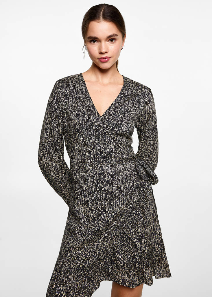 Lightweight fabric. Floral print. Straight design. Short design. V-neck. Long sleeves. Ruffled ends. Cross-locking. Tie fastening