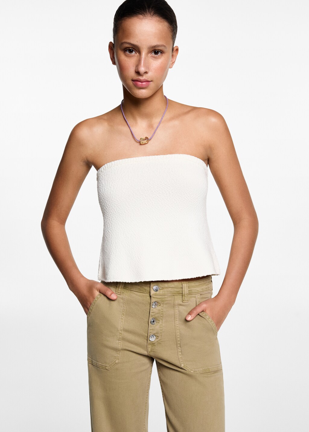 Denim-style cotton fabric. Two pockets. Mid-rise. Straight Design. Button up. Back pockets.