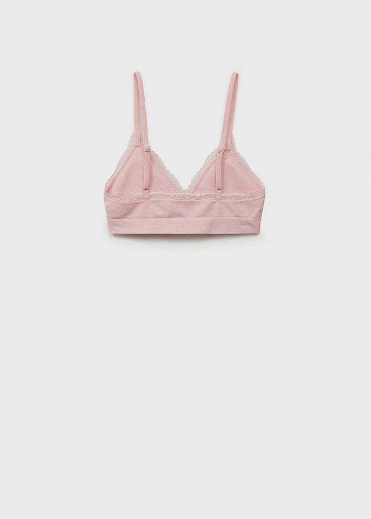 Lace detail triangle braPrice historyInitial price struck through [£ 17.99 ]£ 17.99Second price struck through [£ 13.99 ]£ 13.99Current price [£ 11.99 ]£ 11.99-33%Select a colourPastel PinkSelect your sizeSLast few items!MLast few items!LMeasurementsAddOpenwork detail. With filling. Thin adjustable straps. Elastic straight hemDetails, composition and careStore availability