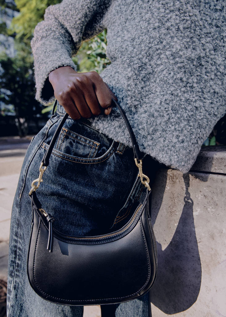 Medium. Faux leather. Adjustable long handle and removable shoulder strap. Removable and adjustable shoulder strap. Zip closure. Inner lining