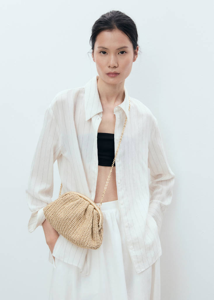 Small size. Shiny finish. Clutch style. Long detachable shoulder strap. Press stud fastening. Inner lining