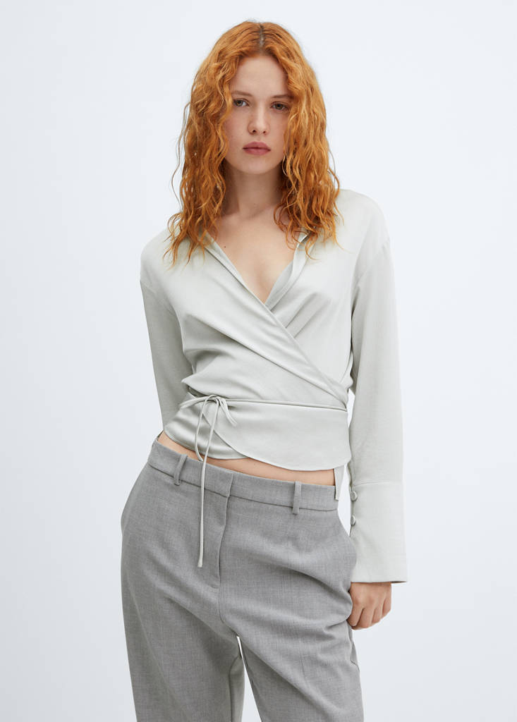 Fluid fabric. Wrap design. Satin finish. Shirt-style V-neck collar. Long sleeves with buttoned cuffs. Ribbon on the waist with tie closure. Office looks. Fitted design