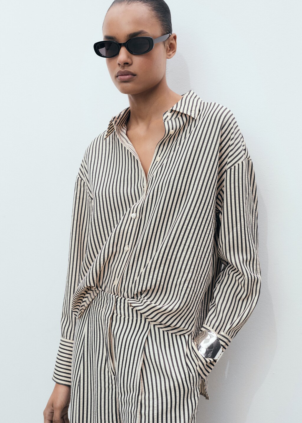 Textured fabric. Stripe design. Oversized design. Shirt collar. Long buttoned sleeves. Button fastening at the front.