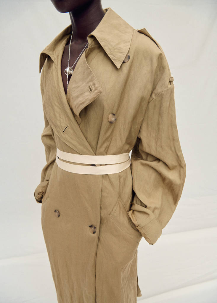Cotton blend fabric. Long design. Oversized design. Wrinkled effect. Wide lapel collar. Lapel with notch. Loops on the shoulders. Long sleeves with buttoned strip cuffs. Belt loops. Removable belt. Two side pockets. Double button fastening. Back vent at the hem. Selection Collection