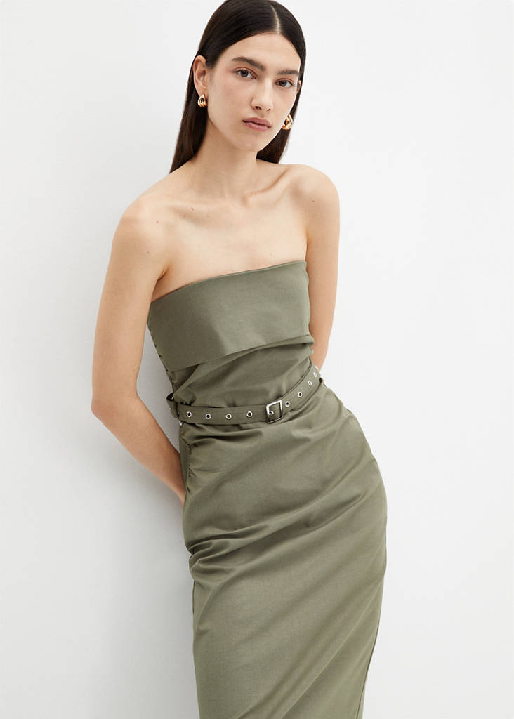 Cotton blend fabric. Midi design. Straight design. Strapless. Sleeveless. Belt loops. Back zip fastening. Back vent at the hem. Removable belt. Party, ceremony and communion collection