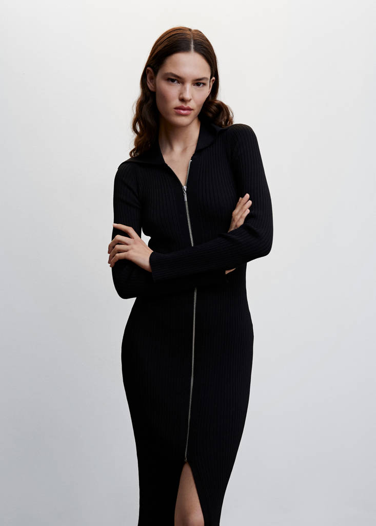 Fine knit fabric. Cable knit fabric. Midi design. Fitted design. Polo neck. Long sleeve. Zip fastening on the front section. Opening in the lower front