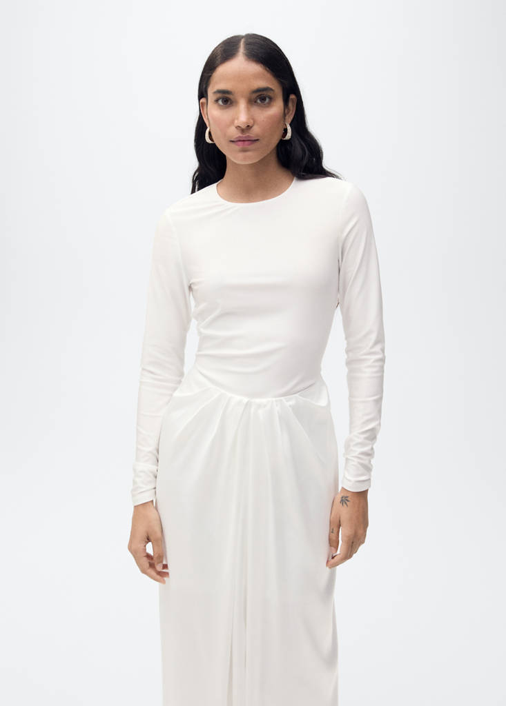 Combined fabrics. Long design. Straight design. Round neck. Long sleeves. Gathered detail on the sleeves. Pleats at the waist. Back zip fastening. Inner lining. Ramadan Collection. This garment belongs to our event collection, designed to make you the perfect guest at any party, wedding or ceremony