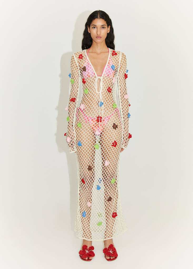 Chunky knit fabric. Openwork design. Long design. V-neckline. Tie closure neckline. Long sleeves. No Fastening. Flower details. Fitted design.