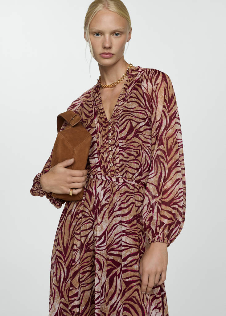 Fluid fabric. Long design. Straight design. V-neck. Long sleeves. Decorative bow. Inner lining. Available Plus. Front closure with buttons. Printed design