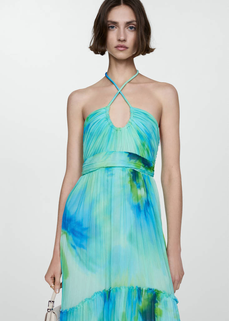 Fluid fabric. A-line design. Long design. Halter neck. Sleeveless. Thin straps. Invisible back zip fastening. Bow fastening on the neck. Ruched details. Pleated details. Inner lining. Party, ceremony and communion collection. Printed design. This garment belongs to our event collection, designed to make you the perfect guest at any party, wedding or ceremony