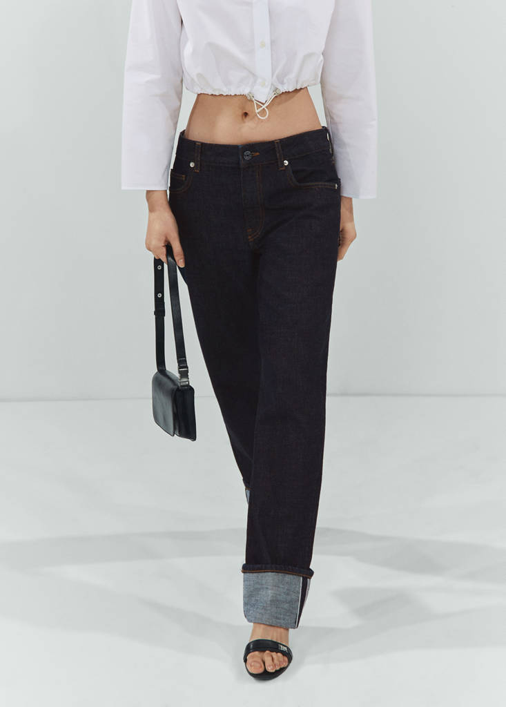 Denim-style cotton fabric. Straight design. Mid-rise. Belt loops. Five pockets. Zip and button fastening. Rolled-up hem. Interior length 75.4 cm