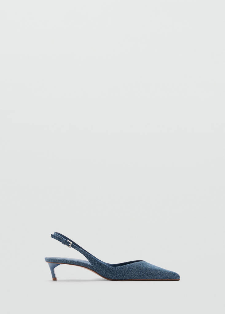 Denim-style cotton fabric. Pointed. Kitten heel. Strap closure with buckle