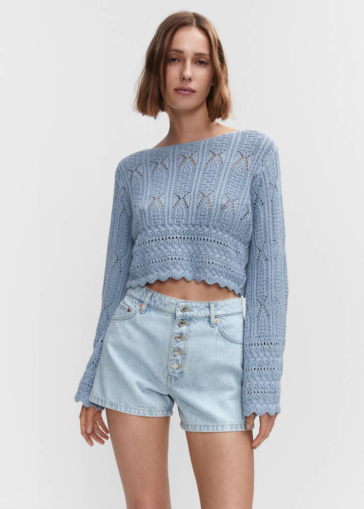 Denim-style cotton fabric. Straight design. Short design. Mid-rise. Belt loops. Five pockets. Button up