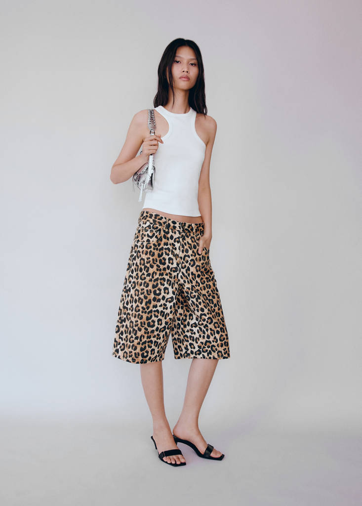 Denim-style cotton fabric. Wide-leg design. Cargo design. Low waist. Leopard print. Belt loops. Five pockets. Zip and button fastening