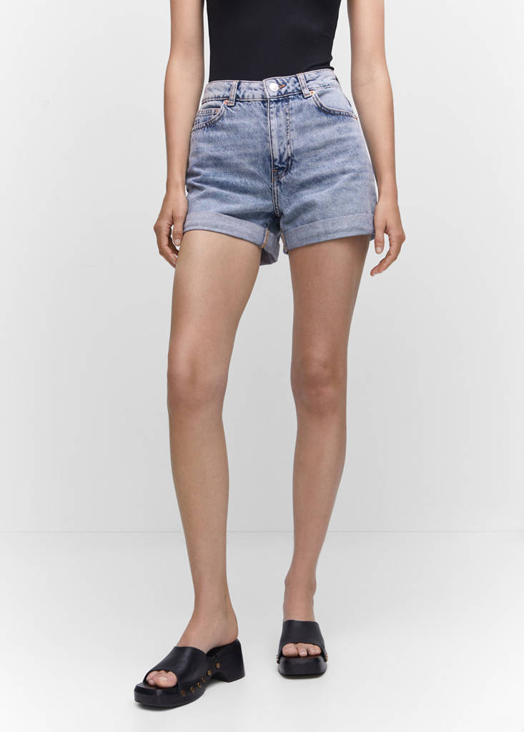High waist. Belt loops. Short design. Medium. Cuffed hem. Zip and button fastening. Available Plus. Mom-fit. 100% Cotton. Side pockets. Patch pockets on the back. Denim-style cotton fabric. No Print. No Fantasy. Short Long. High Waist. Medium Flat Structure. Mom silhouette