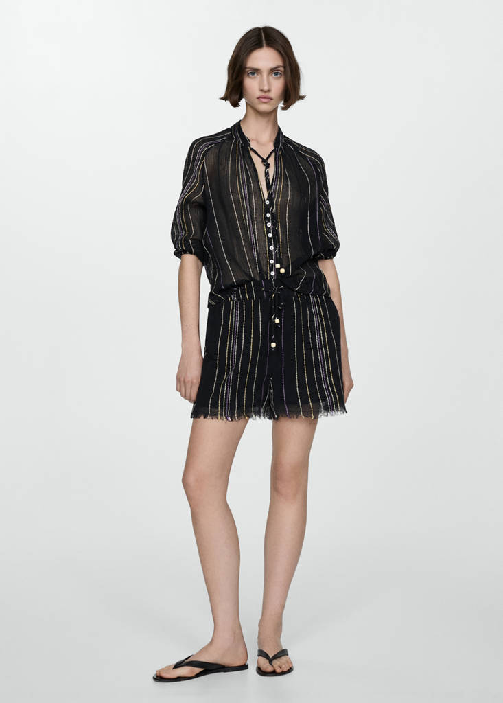 Cotton blend fabric. Short design. Straight design. Elastic waist with tie closure. Frayed hem. Total look. Striped design