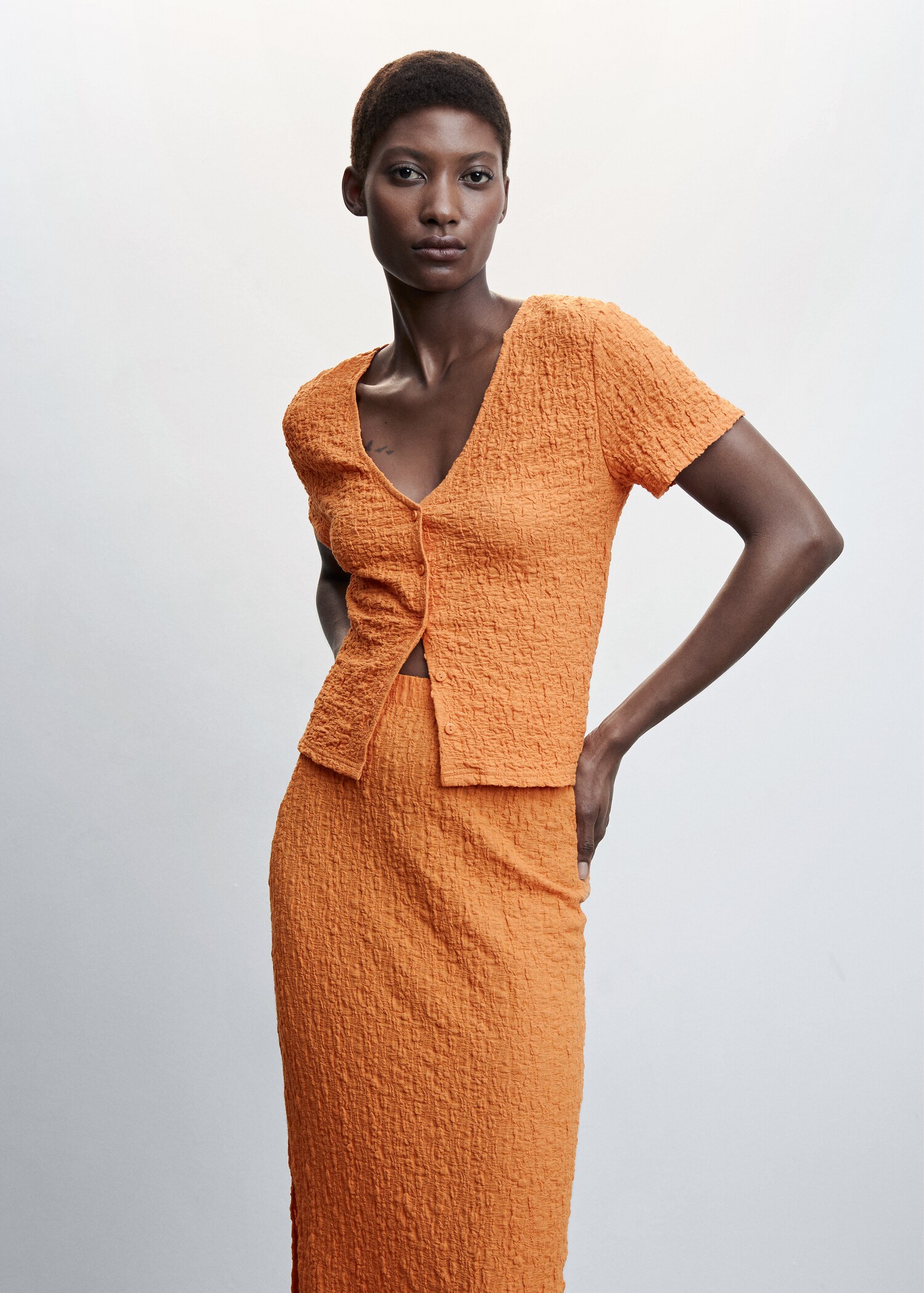 Open textured skirtPrice historyInitial price struck through [£ 25.99 ]£ 25.99Current price [£ 17.99 ]£ 17.99-31%Select a colourOrangeSelect your sizeXXSNot available. I want it!XSNot available. I want it!SNot available. I want it!MNot available. I want it!LNot available. I want it!XLNot available. I want it!XXLNot available. I want it!Size guideNotify meDescriptionCotton-blend fabric. Textured fabric. Fitted design. Midi design. Available in plain and patterned. Elasticated waist. Unclosed. Side slit. Co-ord.See detailsSize guideShare