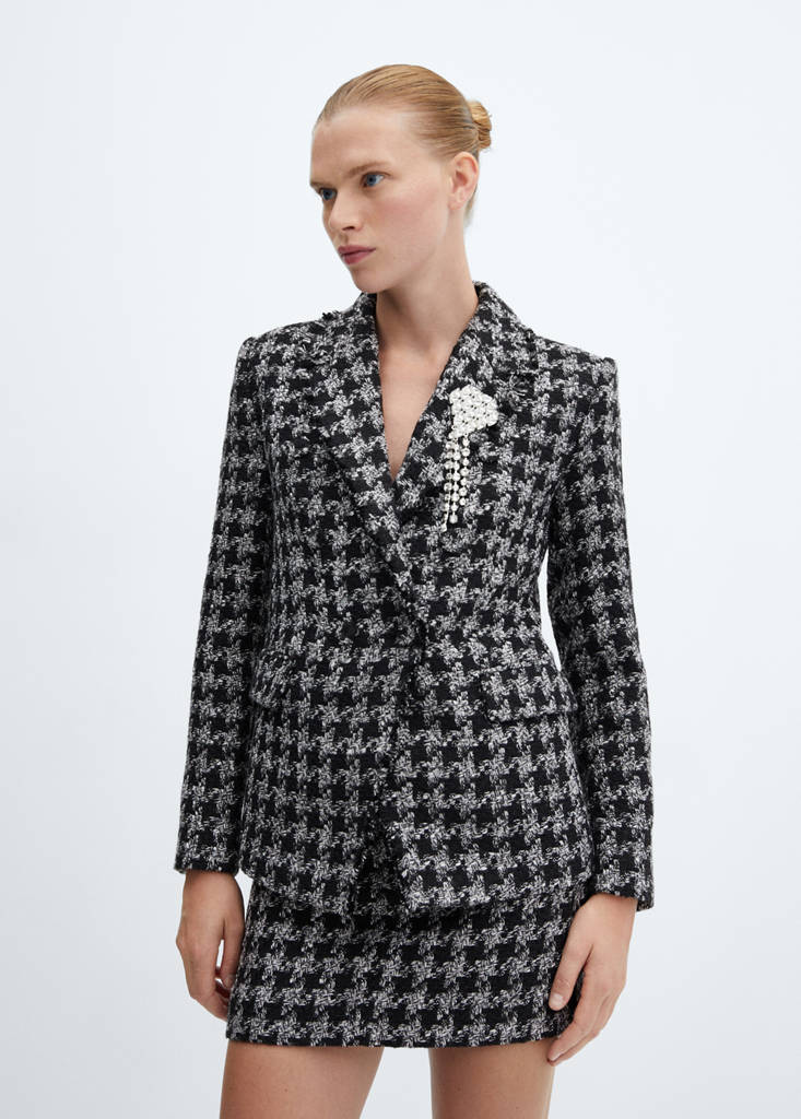 Cotton blend fabric. Tweed fabric. Short design. Straight design. Houndstooth print. Zip and hook fastening. Inner lining. Total look