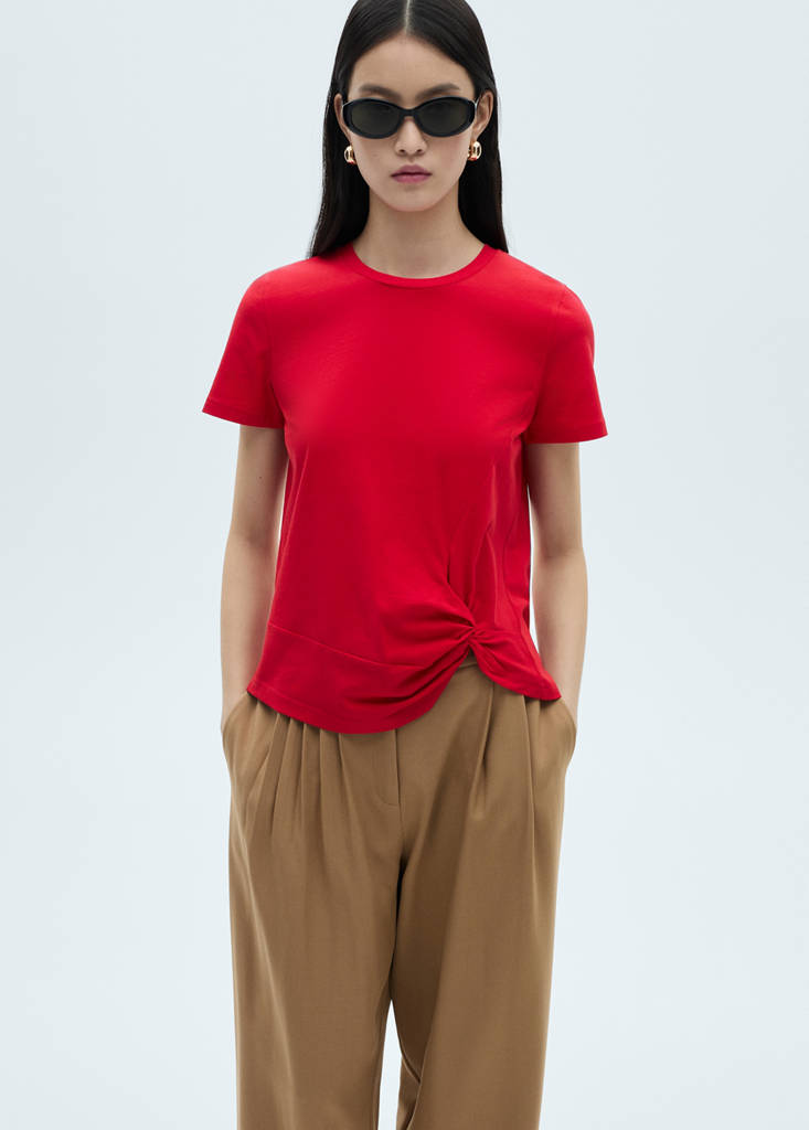 Cotton t-shirt with knot detailPrice historyInitial price struck through [£ 12.99 ]£ 12.99Current price [£ 8.99 ]£ 8.99-31%Select a colourRedThe model is wearing size S and is 5'10" tall.Select your sizeXSNot available. I want it!SNot available. I want it!MNot available. I want it!LNot available. I want it!XLNot available. I want it!DimensionsNotify me100% cotton fabric. Straight design. Short sleeves. Round neck. Knot detail at the front. No FasteningDetails, composition and careStore availabilityItem qualitiesRecycled cottonAt least 20%This fibre is obtained from pre- and post-consumer textile waste that is transformed into new fabrics.