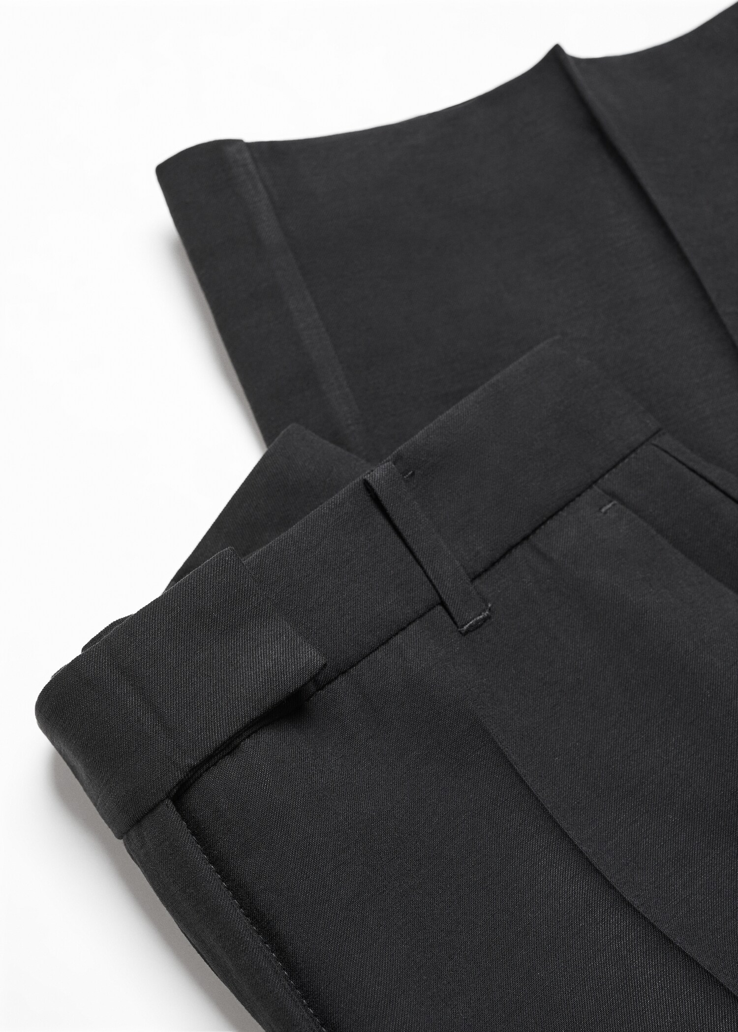 Fluid fabric. Cotton blend fabric. Suit style. Long design. Wide-leg design. Low waist. Belt loops. Concealed button, hook and zip fastening. Two side pockets. Two pockets with flaps on the back. Pleats detail. Available Plus. Office looks.