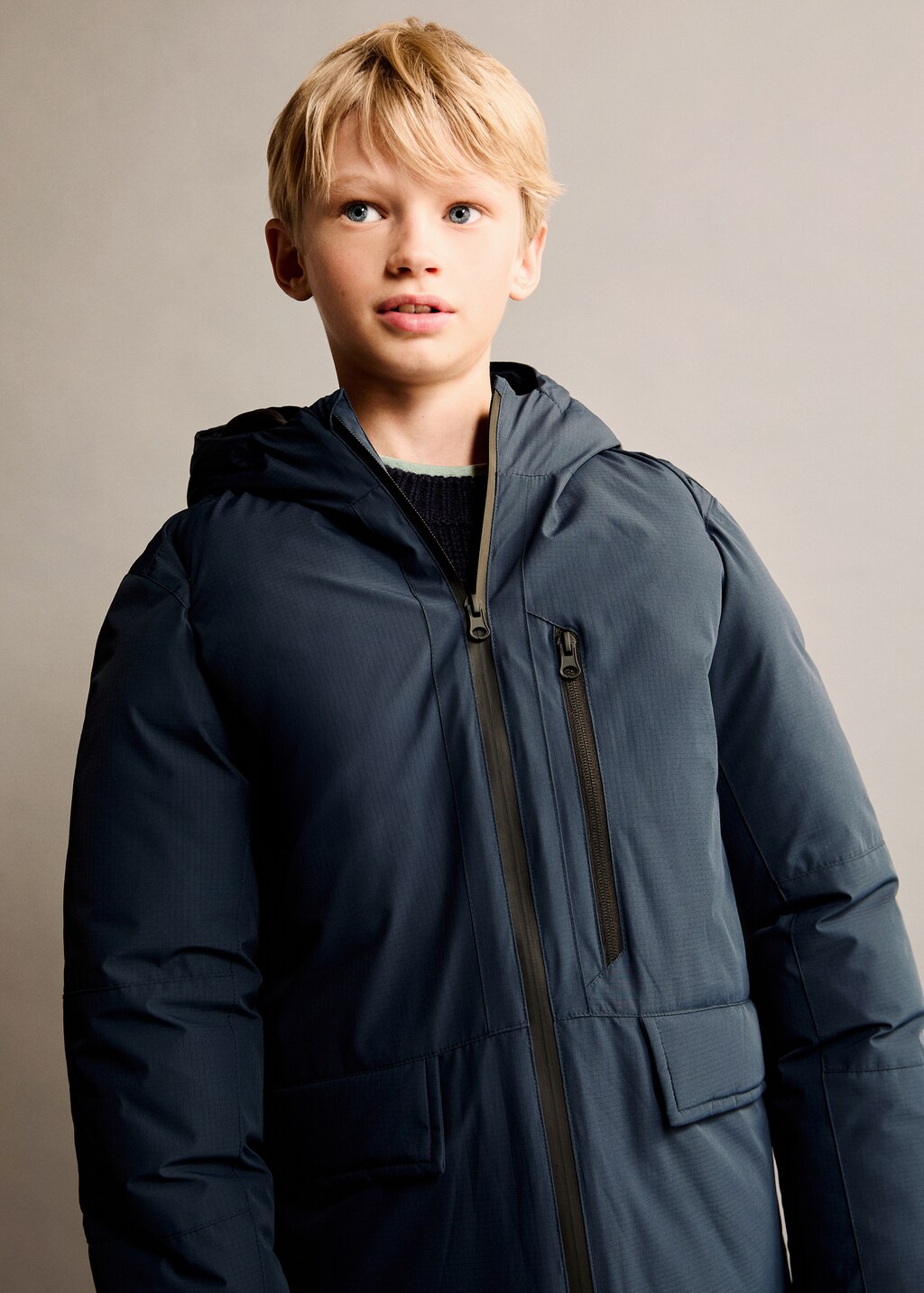 Κουκούλα. Ίσιο σχέδιο. Εσωτερική φόδρα. Ετικέτα για προσωπικά στοιχεία. Μπροστινό κλείσιμο με αντανακλαστικό φερμουάρ. Καπιτονέ σχέδιο. Zιβάγκo. Τρεις τσέπες στο μπροστινό μέρος.
