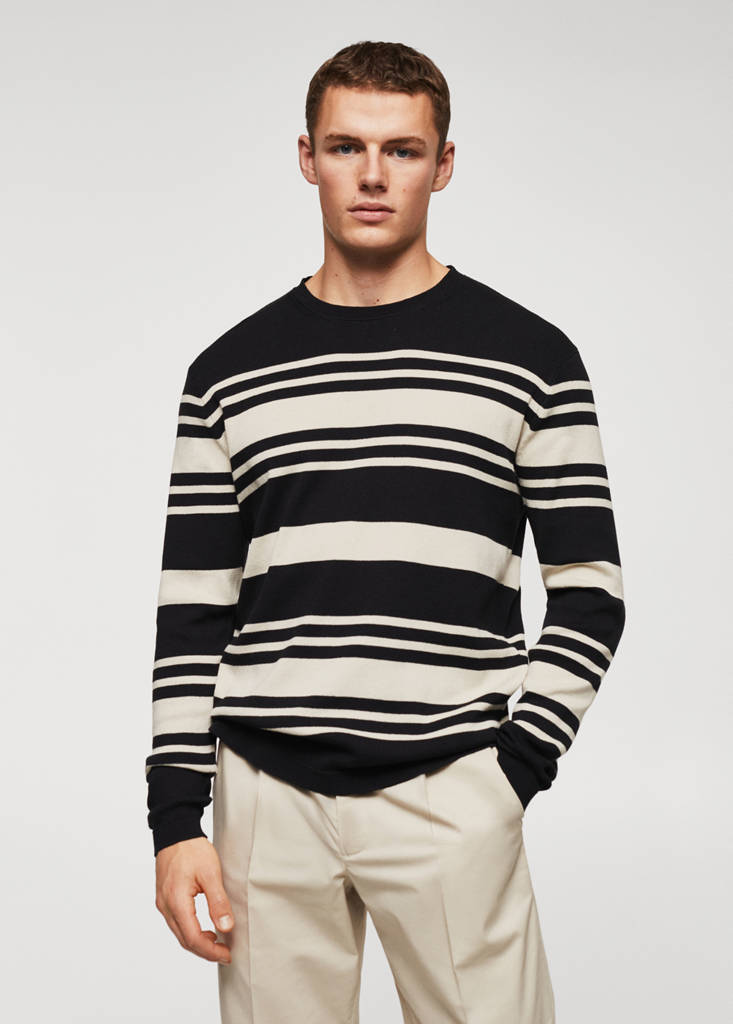 Ριγέ σχέδιο. Βαμβακερό ύφασμα. Ύφασμα από λεπτή πλέξη. Λαιμός στρογγυλός. Μακρύ μανίκι. Το μοντέλο έχει ύψος 1,83 μ. και φοράει μέγεθος Μ