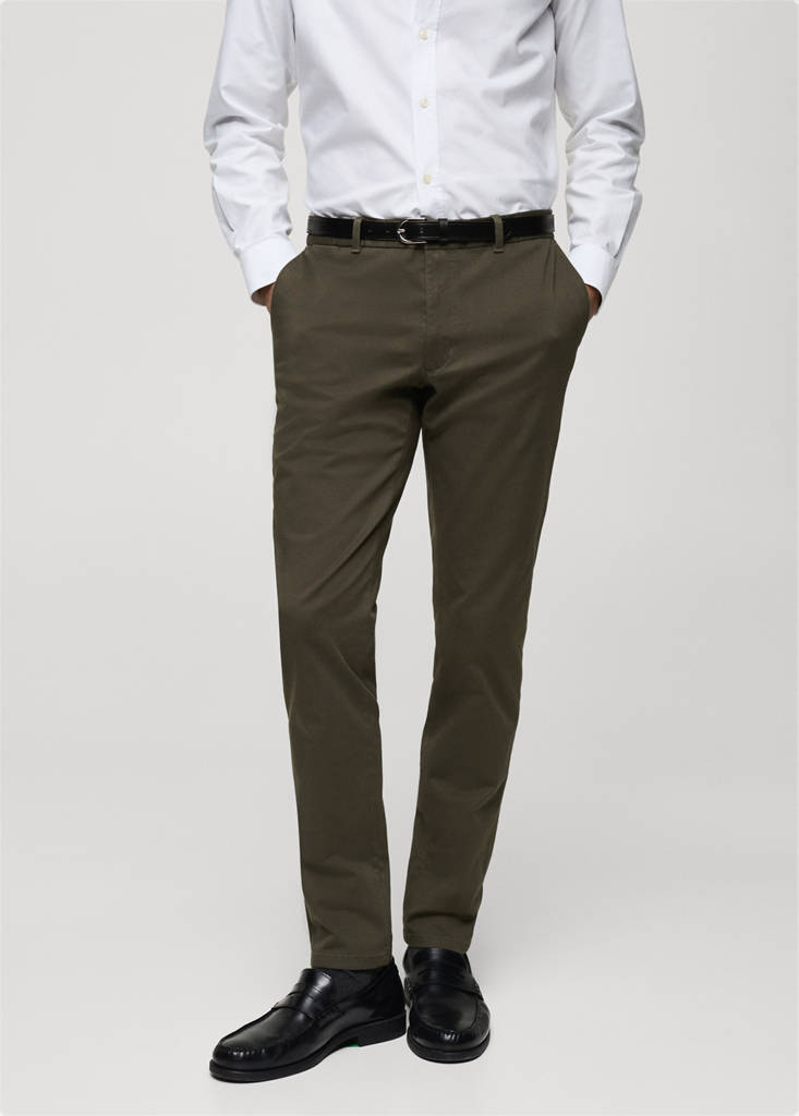 Ύφασμα μείγμα βαμβακιού. Στυλ chinos. Slim fit. Κλείσιμο με φερμουάρ και κουμπί. Θηλιές για ζώνη. Πέντε τσέπες. Δύο πλαϊνές τσέπες. Δύο τσέπες με ρέλι στο πίσω μέρος