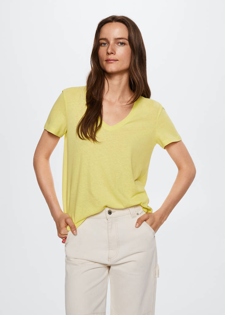 Ύφασμα απο βαμβάκι και λινό. Σχέδιο ίσια γραμμή. Ντεκολτέ βε. Κοντό μανίκι. Διαθέσιμο Plus
