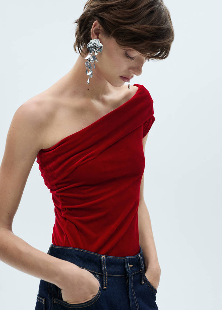 Ύφασμα από βελούδο. Ελαστικό ύφασμα. Σχέδιο off-shoulder. Ασύμμετρος σχεδιασμός. Στενή γραμμή. Ανοιχτοί ώμοι. Χωρίς μανίκια. Κλείσιμο με κουμπιά πίεσης στο κάτω μέρος. Κολεξιόν για πάρτι και εκδηλώσεις