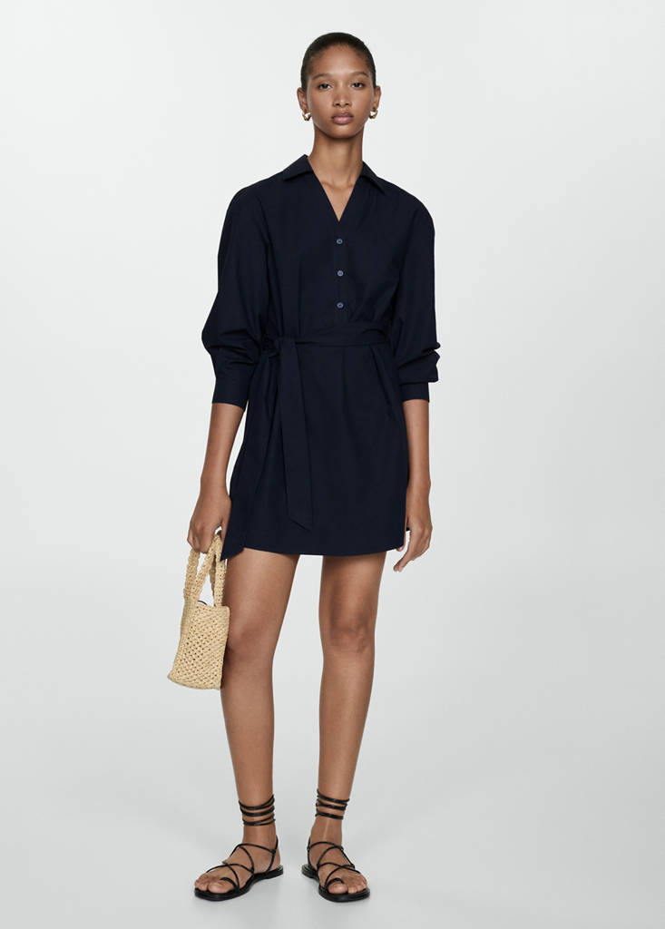 Ίσιο σχέδιο. Κοντό σχέδιο. Στυλ πουκάμισο. Γιακάς πουκαμίσου. Μανίκι τριών τετάρτων φουσκωτό. Φιόγκος στη μέση. Κλείσιμο με κουμπιά στο μπροστινό μέρος. Ύφασμα 100% βαμβάκι
