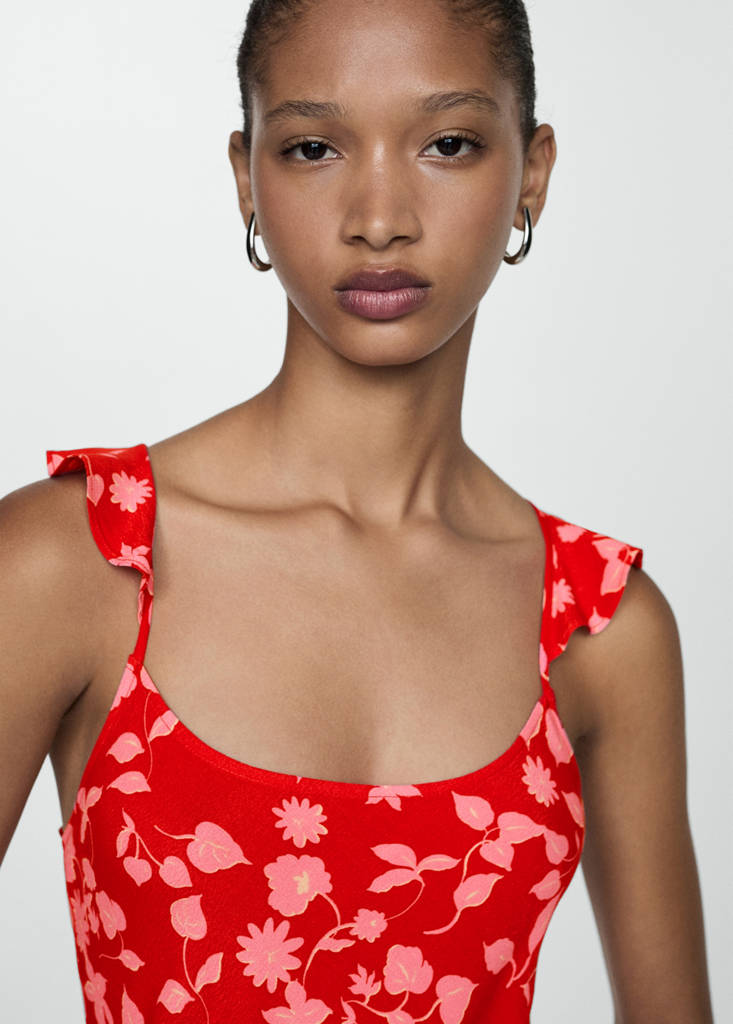 Ρευστό ύφασμα. Μακρύς σχεδιασμός. Ίσιο σχέδιο. Λουλουδάτο σχέδιο. Ντεκολτέ στρογγυλό. Χωρίς μανίκια. Λεπτές χιαστί τιράντες πίσω. Δέσιμο με φιόγκο στην πλάτη